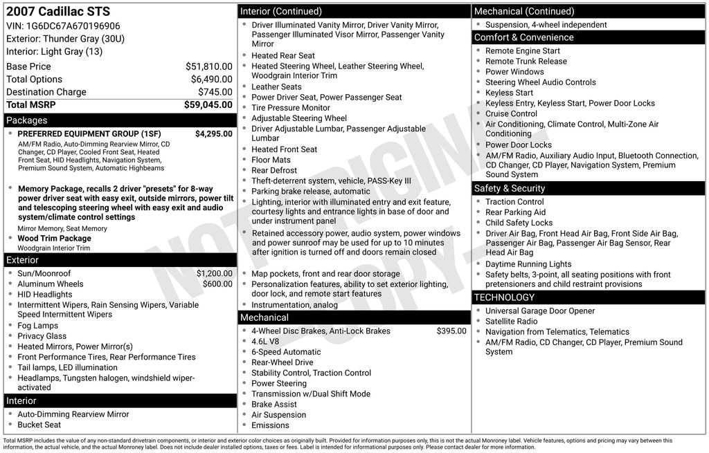 Northstar 4.6L V8 SFI DOHC VVT, Light Gray Leather, 4-Wheel Disc Brakes, ABS brakes, Air Conditioning, Alloy wheels, AM/FM radio: XM, Auto tilt-away steering wheel, Auto-dimming door mirrors, Auto-dimming Rear-View mirror, Automatic temperature control, Brake assist, Bumpers: body-color, Cargo Net, CD player, Delay-off headlights, Driver door bin, Driver vanity mirror, Driver/Front Passenger 4-Way Power Lumbar Control, Dual front impact airbags, Dual front side impact airbags, Electronic Stability Control, Emergency communication system: OnStar, Eucalyptus Wood Trim Package, Four wheel independent suspension, Front anti-roll bar, Front Bucket Seats, Front Center Armrest, Front dual zone A/C, Front fog lights, Front reading lights, Fully automatic headlights, Garage door transmitter, Genuine wood console insert, Genuine wood dashboard insert, Genuine wood door panel insert, Heated door mirrors, Heated front seats, Heated Leather-Wrapped Steering Wheel, Heated Rear Outboard Seating Positions, Heated rear seats, Heated steering wheel, Illuminated entry, Leather Shift Knob, Leather steering wheel, Low tire pressure warning, Memory Package, Memory seat, Nuance Leather Seating Surfaces, Occupant sensing airbag, Outside temperature display, Overhead airbag, Overhead console, Panic alarm, Passenger door bin, Passenger vanity mirror, Power door mirrors, Power driver seat, Power passenger seat, Power steering, Power windows, Radio data system, Rain sensing wipers, Rainsense Wipers, Rear anti-roll bar, Rear reading lights, Rear seat center armrest, Rear window defroster, Remote keyless entry, Security system, Speed control, Speed-sensing steering, Steering wheel memory, Steering wheel mounted audio controls, Tachometer, Telescoping steering wheel, Tilt steering wheel, Tire Pressure Monitoring System, Traction control, Trip computer, Universal Home Remote, Variably intermittent wipers, Voltmeter, XM Satellite Radio, Northstar 4.6L V8 SFI DOHC VVT, Light Gray Leather. Thunder Gray 2007 Cadillac STS V8 6-Speed Automatic Electronic Northstar 4.6L V8 SFI DOHC VVT RWD
