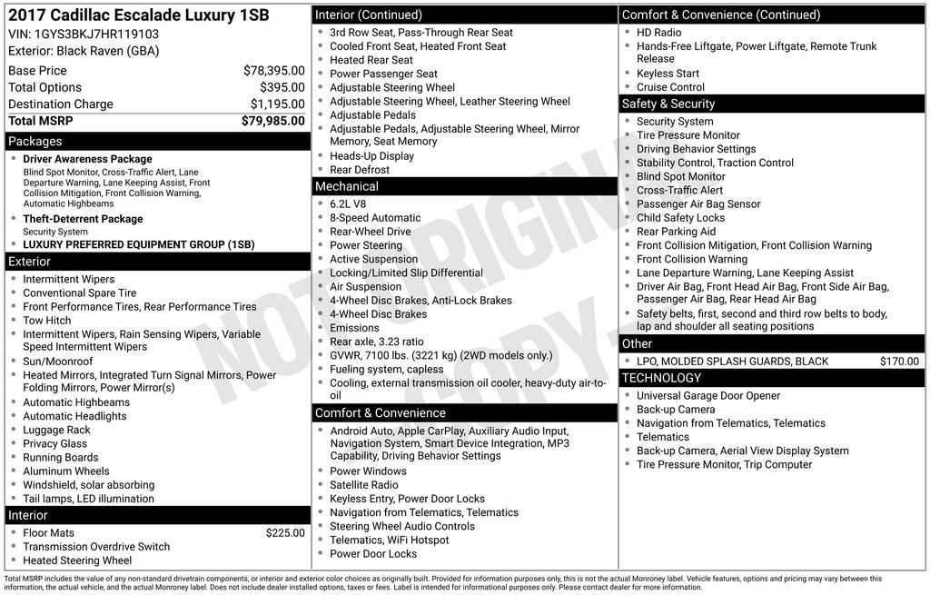 Under the hood, this Escalade Luxury is powered by a potent 6.2L Variable Valve Timing V8 SIDI engine, paired with an 8-speed automatic transmission and rear-wheel drive. With 15 city and 22 highway MPG, you'll enjoy a commanding presence on the road while maintaining impressive fuel efficiency.