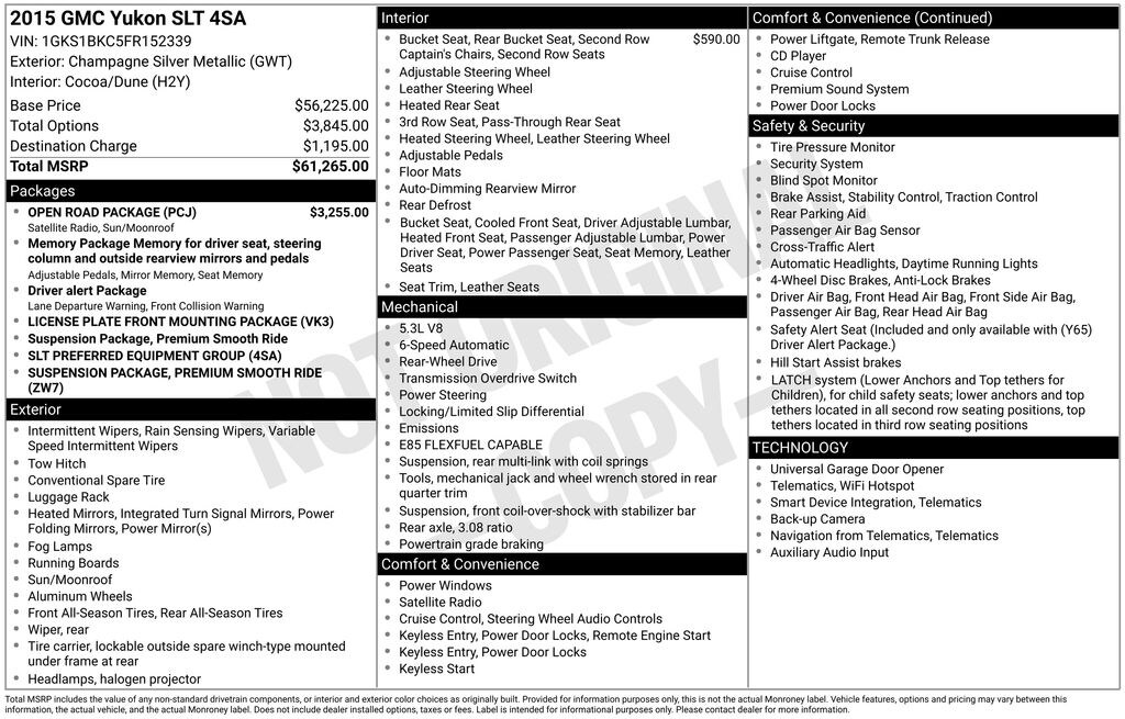 3.08 Rear Axle Ratio, 3rd row seats: split-bench, 4-Wheel Disc Brakes, 5 Auxiliary 12-volt Power Outlets, 9 Speakers, ABS brakes, Adjustable pedals, Air Conditioning, Alloy wheels, AM/FM radio: SiriusXM, AppLink/Apple CarPlay and Android Auto, Auto-dimming door mirrors, Auto-dimming Rear-View mirror, Automatic temperature control, Black Assist Steps w/Chrome Strip, Brake assist, Bumpers: body-color, CD player, Color-Keyed Heated Leather-Wrapped Steering Wheel, Compass, Delay-off headlights, Driver Alert Package, Driver door bin, Driver vanity mirror, Dual front impact airbags, Dual front side impact airbags, Electronic Stability Control, Emergency communication system: OnStar Directions & Connections, Exterior Parking Camera Rear, Front anti-roll bar, Front Bucket Seats, Front Center Armrest, Front dual zone A/C, Front fog lights, Front reading lights, Front wheel independent suspension, Fully automatic headlights, Garage door transmitter, Heated & Cooled Full-Feature Reclining Bucket Seats, Heated door mirrors, Heated front seats, Heated rear seats, Heated steering wheel, Illuminated entry, Inside Rear-View Auto-Dimming Mirror, License Plate Front Mounting Package, Low tire pressure warning, Memory Package, Memory seat, Occupant sensing airbag, OnStar Basic Plan For 5 Years, OnStar w/4G LTE, Open Road Package, Outside temperature display, Overhead airbag, Overhead console, Panic alarm, Passenger door bin, Passenger vanity mirror, Passive Entry System, Pedal memory, Perforated Leather-Appointed Seat Trim, Power 2nd Row 60/40 Split-Folding Bench Seat, Power door mirrors, Power driver seat, Power Liftgate, Power passenger seat, Power Rear Liftgate, Power Second Row Bucket Seats, Power steering, Power Tilt & Telescopic Steering Column, Power Tilt-Sliding Sunroof w/Express-Open/Close, Power windows, Power-Adjustable Pedals For Accelerator & Brake, Preferred Equipment Group 4SA, Premium audio system: IntelliLink, Premium Smooth Ride Suspension Package, Push Button Keyless Start, Radio: AM/FM/SiriusXM/HD, Radio: AM/FM/SiriusXM/HD w/Navigation, Rain sensing wipers, Rear air conditioning, Rear anti-roll bar, Rear Cross-Traffic Alert, Rear reading lights, Rear Seat Blu-Ray/DVD Entertainment System, Rear seat center armrest, Rear window defroster, Rear window wiper, Remote Keyless Entry, Remote keyless entry, Roof rack: rails only, Safety Alert Seat, Security system, Side Blind Zone Alert w/Lane Change Alert, Speed control, Speed-sensing steering, Split folding rear seat, Spoiler, Steering wheel memory, Steering wheel mounted audio controls, Tachometer, Telescoping steering wheel, Tilt steering wheel, Traction control, Trip computer, Turn signal indicator mirrors, Universal Home Remote, Variably intermittent wipers, Ventilated front seats, Voltmeter, Wheels: 18" x 8.5" Bright Machined Aluminum, Wireless Charging. Champagne Silver Metallic 2015 GMC Yukon SLT 6-Speed Automatic Electronic with Overdrive EcoTec3 5.3L V8 RWD