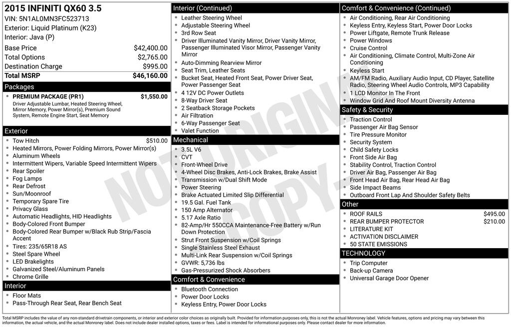 18" 5-Spoke Aluminum Alloy Wheels, 2-Way Driver's Seat Power Lumbar Support, 3rd row seats: bench, 4-Wheel Disc Brakes, 5.17 Axle Ratio, 6 Speakers, ABS brakes, Activation Disclaimer, Air Conditioning, Alloy wheels, AM/FM radio: SiriusXM, AM/FM/CD/MP3 Audio System, Auto-dimming Rear-View mirror, Automatic temperature control, Bodyside moldings, Brake assist, Bumpers: body-color, CD player, Delay-off headlights, Driver door bin, Driver vanity mirror, Dual front impact airbags, Dual front side impact airbags, Dual Occupant Memory System, Electronic Stability Control, Enhanced Intelligent Key Memory, Entry & Exit Assist, Floor Mats, Four wheel independent suspension, Front anti-roll bar, Front Bucket Seats, Front Center Armrest w/Storage, Front dual zone A/C, Front fog lights, Front reading lights, Fully automatic headlights, Garage door transmitter, Heated door mirrors, Heated Front Seats, Heated front seats, Heated Steering Wheel, High intensity discharge headlights: Bi-Xenon, Hitch Finisher, Hitch Receiver, Illuminated entry, Leather Shift Knob, Leather steering wheel, Leather-Appointed Seats, Literature Kit, Low tire pressure warning, Occupant sensing airbag, Outside Mirrors w/Reverse Tilt-Down Feature, Outside temperature display, Overhead airbag, Overhead console, Panic alarm, Passenger door bin, Passenger vanity mirror, Power door mirrors, Power driver seat, Power Liftgate, Power moonroof, Power passenger seat, Power steering, Power windows, Premium Package, Radio data system, Radio: AM/FM/CD/DVD w/MP3 Playback Capability, Rear air conditioning, Rear anti-roll bar, Rear Bumper Protector, Rear reading lights, Rear seat center armrest, Rear window defroster, Rear window wiper, Reclining 3rd row seat, Remote Engine Start, Remote keyless entry, Roof Rails, Security system, Speed control, Speed-sensing steering, Speed-Sensitive Wipers, Split folding rear seat, Spoiler, Steering wheel mounted audio controls, Tachometer, Telescoping steering wheel, Tilt steering wheel, Tow Hitch & Harness, Traction control, Trip computer, Variably intermittent wipers. Liquid Platinum 2015 INFINITI QX60 Sport-Tuned CVT 3.5L V6 FWD