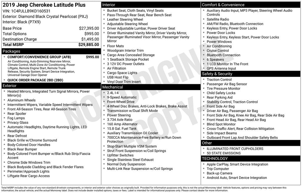 115V Auxiliary Power Outlet, 3.734 Axle Ratio, 4-Wheel Disc Brakes, 6 Speakers, ABS brakes, Air Conditioning, Air Conditioning ATC w/Dual Zone Control, Alloy wheels, AM/FM radio: SiriusXM, Anti-whiplash front head restraints, Apple CarPlay/Android Auto, Auto-Dimming Rear-View Mirror, Auxiliary Transmission Oil Cooler, Brake assist, Bumpers: body-color, Cloth/Premium Vinyl Bucket Seats, Comfort/Convenience Group, Compass, Delay-off headlights, Driver door bin, Driver vanity mirror, Dual front impact airbags, Dual front side impact airbags, Electronic Stability Control, Four wheel independent suspension, Front anti-roll bar, Front Bucket Seats, Front Center Armrest, Front fog lights, Front reading lights, Fully automatic headlights, Heated door mirrors, Humidity Sensor, Illuminated entry, Illuminated Front Cupholders (DISC), Integrated Voice Command w/Bluetooth, Knee airbag, Leather Shift Knob, Low tire pressure warning, Normal Duty Suspension, Occupant sensing airbag, Outside temperature display, Overhead airbag, Overhead console, Panic alarm, ParkView Rear Back-Up Camera, Passenger door bin, Passenger vanity mirror, Power door mirrors, Power driver seat, Power Liftgate, Power steering, Power windows, Premium Air Filter, Quick Order Package 2BD, Radio data system, Radio: Uconnect 4 w/7" Display, Rear anti-roll bar, Rear reading lights, Rear seat center armrest, Rear side impact airbag, Rear window defroster, Rear window wiper, Remote keyless entry, Remote Start System, Roof rack: rails only, Security Alarm, SiriusXM Satellite Radio, Speed control, Speed-sensing steering, Split folding rear seat, Spoiler, Steering wheel mounted audio controls, Stop-Start Multiple VSM System, Tachometer, Telescoping steering wheel, Tilt steering wheel, Traction control, Trip computer, Turn signal indicator mirrors, Universal Garage Door Opener, USB Host Flip, Variably intermittent wipers, Voltmeter, Wheels: 17" x 7" Satin Carbon Aluminum. Diamond Black Crystal Pearlcoat 2019 Jeep Cherokee Latitude Plus 9-Speed 948TE Automatic 2.4L I4 FWD