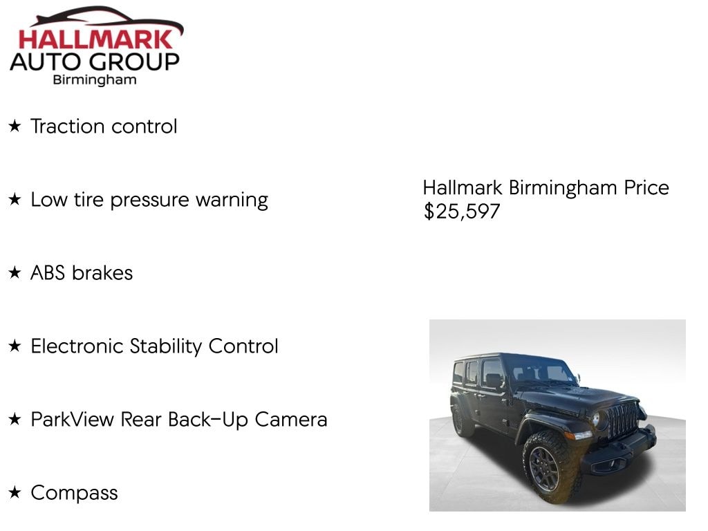 ABS brakes, Compass, Electronic Stability Control, Low tire pressure warning, ParkView Rear Back-Up Camera, Traction control. Black Clearcoat 2021 Jeep Wrangler Unlimited Sport 8-Speed Automatic 2.0L I4 DOHC 4WD
