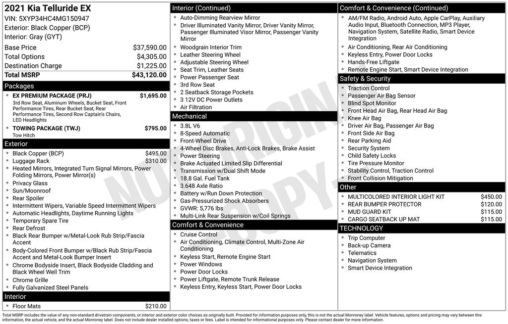 2nd Row Captain Chairs, 3.648 Axle Ratio, 3rd row seats: split-bench, 4-Wheel Disc Brakes, 6 Speakers, ABS brakes, Air Conditioning, Alloy wheels, AM/FM radio: SiriusXM, Apple CarPlay & Android Auto, Auto-dimming Rear-View mirror, Automatic temperature control, Brake assist, Bumpers: body-color, Cargo Seatback Up Mat, Carpeted Floor Mats, Compass, Cross Bars, Delay-off headlights, Driver door bin, Driver vanity mirror, Dual front impact airbags, Dual front side impact airbags, Electronic Stability Control, Emergency communication system: 911 Connect, EX Premium Package, Four wheel independent suspension, Front anti-roll bar, Front Bucket Seats, Front Center Armrest, Front dual zone A/C, Front reading lights, Fully automatic headlights, Heated & Ventilated Front Bucket Seats, Heated door mirrors, Heated front seats, Illuminated entry, Knee airbag, Leather Seat Trim, Leather Shift Knob, Leather steering wheel, LED Headlamps, Low tire pressure warning, Mud Guard Kit, Multicolored Interior Light Kit, Navigation System, Occupant sensing airbag, Outside temperature display, Overhead airbag, Overhead console, Panic alarm, Passenger door bin, Passenger vanity mirror, Power door mirrors, Power driver seat, Power Liftgate, Power moonroof, Power passenger seat, Power steering, Power windows, Radio data system, Radio: AM/FM/SIRIUS Display Audio, Rear air conditioning, Rear anti-roll bar, Rear audio controls, Rear Bumper Protector, Rear reading lights, Rear seat center armrest, Rear window defroster, Rear window wiper, Reclining 3rd row seat, Remote keyless entry, Roof rack: rails only, Satin Chrome Roof Rails, Security system, Self Leveling Rear Suspension, Smart Key w/ Push Button and Remote Start, Speed control, Speed-sensing steering, Split folding rear seat, Spoiler, Steering wheel mounted audio controls, Tachometer, Telescoping steering wheel, Tilt steering wheel, Tow Hitch w/Harness (TOF), Towing Package, Traction control, Trip computer, Turn signal indicator mirrors, Variably intermittent wipers, Ventilated front seats, Wheels: 7.5" x 18" Machined Finish Alloy, Wheels: 7.5" x 20" Machined Finish Alloy. Black Copper 2021 Kia Telluride EX 8-Speed Automatic 3.8L V6 DGI DOHC Dual CVVT FWD