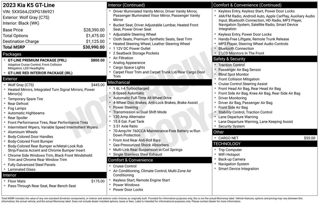 4-Wheel Disc Brakes, 6 Speakers, ABS brakes, Air Conditioning, Alloy wheels, AM/FM radio: SiriusXM, Apple CarPlay & Android Auto, Auto High-beam Headlights, Automatic temperature control, Brake assist, Bumpers: body-color, Cargo Net, Carpeted Floor Mats, Cloth/SynTex Seat Trim, Delay-off headlights, Driver door bin, Driver vanity mirror, Dual front impact airbags, Dual front side impact airbags, Electronic Stability Control, Forward Collision Avoidance-Assist, Four wheel independent suspension, Front anti-roll bar, Front Bucket Seats, Front Center Armrest, Front dual zone A/C, Front fog lights, Front reading lights, Fully automatic headlights, GT-Line Premium Package, GT-Line Red Interior Package, Heated door mirrors, Heated Front Bucket Seats, Heated front seats, Heated steering wheel, Highway Driving Assist, Illuminated entry, Knee airbag, LED Projection Headlamps, Low tire pressure warning, Navigation System, Occupant sensing airbag, Outside temperature display, Overhead airbag, Overhead console, Panic alarm, Passenger door bin, Passenger vanity mirror, Power door mirrors, Power driver seat, Power steering, Power windows, Radio data system, Radio: AM/FM/MP3 Audio System, Rear anti-roll bar, Rear seat center armrest, Rear side impact airbag, Rear window defroster, Remote keyless entry, Security system, Smart Cruise Control w/Stop & Go, Speed control, Speed-sensing steering, Split folding rear seat, Spoiler, Sport steering wheel, Steering wheel mounted audio controls, Tachometer, Telescoping steering wheel, Tilt steering wheel, Traction control, Trip computer, Turn signal indicator mirrors, Variably intermittent wipers, Wheels: 18" Gloss Black Machined Finish Alloy. Wolf Gray 2023 Kia K5 GT-Line 8-Speed Automatic 1.6L I4 DGI Turbocharged DOHC 16V LEV3-ULEV70 180hp AWD