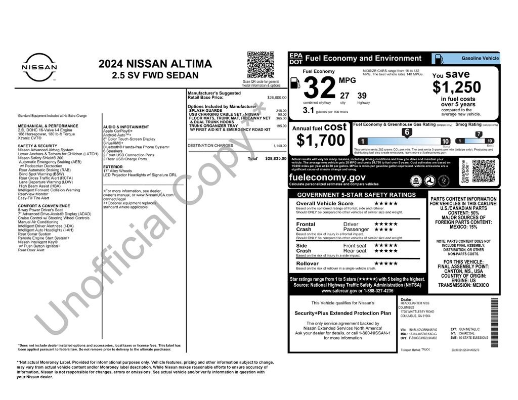 CVT with Xtronic, 17" Alloy Wheels, 4-Wheel Disc Brakes, 6 Speakers, ABS brakes, Air Conditioning, Alloy wheels, AM/FM radio: SiriusXM, Auto High-beam Headlights, Blind Spot Warning, Body-Colored Splash Guards, Brake assist, Bumpers: body-color, Cloth Seat Trim, Delay-off headlights, Driver door bin, Driver vanity mirror, Dual front impact airbags, Dual front side impact airbags, Electronic Stability Control, Floor Mats/Trunk Mat/Hideaway Net, Four wheel independent suspension, Front anti-roll bar, Front Bucket Seats, Front Center Armrest, Front reading lights, Fully automatic headlights, Illuminated entry, Knee airbag, Low tire pressure warning, NissanConnect featuring Apple CarPlay, Occupant sensing airbag, Outside temperature display, Overhead airbag, Overhead console, Panic alarm, Passenger door bin, Passenger vanity mirror, Power door mirrors, Power driver seat, Power steering, Power windows, Radio data system, Radio: AM/FM Audio System, Rear anti-roll bar, Rear Parking Sensors, Rear reading lights, Rear seat center armrest, Rear side impact airbag, Rear window defroster, Remote keyless entry, Security system, Speed control, Speed-sensing steering, Speed-Sensitive Wipers, Split folding rear seat, Steering wheel mounted audio controls, Tachometer, Telescoping steering wheel, Tilt steering wheel, Traction control, Trip computer, Trunk Organizer Tray, USB Charging Cable Set - Nissan, Variably intermittent wipers, CVT with Xtronic. Gun Metallic 2024 Nissan Altima 2.5 SV CVT with Xtronic 2.5L 4-Cylinder DOHC 16V FWD