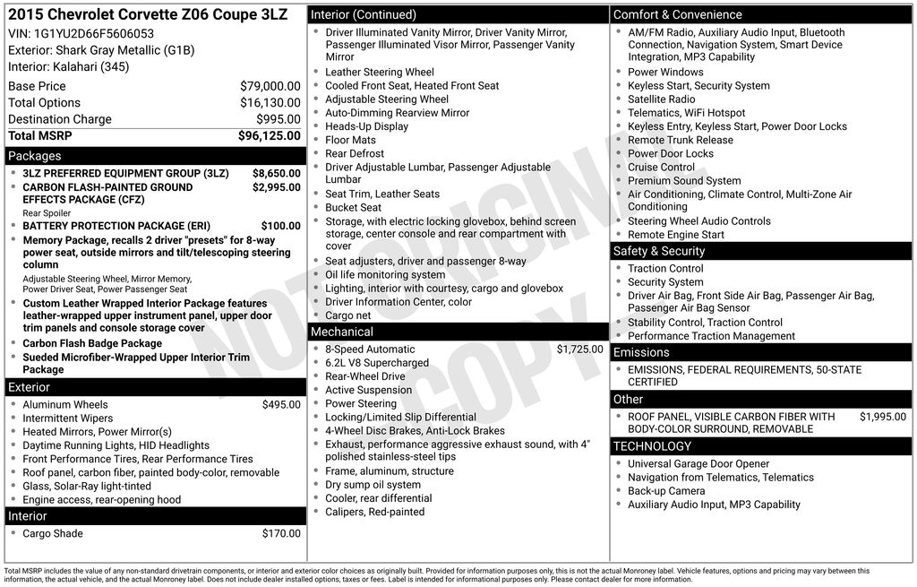 2.41 Limited-Slip Rear Axle Ratio, 3LZ Interior Trim, 4-Wheel Disc Brakes, 8-Way Driver & Passenger Seat Adjusters, 9 Speakers, ABS brakes, Air Conditioning, Alloy wheels, AM/FM radio: SiriusXM, Auto-Dimming Inside Frameless Rearview Mirror, Automatic temperature control, Battery Protection Package, Body-Color Outside Heated Power-Adjustable Mirrors, Bose Advanced 10-Speaker Audio System Feature, Bose Premium 9-Speaker Audio System Feature, Bumpers: body-color, Carbon Flash-Painted Ground Effects Package, Cargo Net, Cargo Shade w/Crossed Flag Logo (LPO), Compass, Custom Leather Wrapped Interior Package, Delay-off headlights, Driver door bin, Driver vanity mirror, Dual front impact airbags, Dual front side impact airbags, Electronic Stability Control, Emergency communication system: OnStar Directions & Connections, Exterior Parking Camera Rear, Four wheel independent suspension, Front anti-roll bar, Front Bucket Seats, Front Center Armrest, Front dual zone A/C, Front reading lights, Fully automatic headlights, GT Bucket Seats, Head-Up Display, Heads-Up Display, Heated & Vented Driver & Passenger Seats, Heated door mirrors, High-Intensity Discharge Headlights, Illuminated entry, Leather Shift Knob, Leather steering wheel, Low tire pressure warning, Luggage Shade, Memory Package, Mulan Perforated Leather Seating Surfaces, Occupant sensing airbag, Outside temperature display, Painted Body-Color Carbon Fiber Removable Roof Panel, Panic alarm, Passenger door bin, Passenger vanity mirror, Performance Data & Video Recorder, Power door mirrors, Power driver seat, Power Lumbar/Bolster Seat Adjusters, Power passenger seat, Power steering, Power windows, Preferred Equipment Group 3LZ, Premium audio system: Chevrolet MyLink, Radio data system, Radio: Chevrolet MyLink w/Navigation, Rear anti-roll bar, Rear window defroster, Remote keyless entry, Remote Vehicle Starter System, Speed control, Speed-sensing steering, Spoiler, Sport steering wheel, Steering wheel mounted audio controls, Sueded Microfiber-Wrapped Interior Trim Package, Tachometer, Telescoping steering wheel, Theft Deterrent System, Tilt steering wheel, Traction control, Trip computer, Universal Home Remote, Variably intermittent wipers, Visible Carbon Fiber Removable Roof Panel, Voltmeter, Wheels: 19" x 10" Fr & 20" x 12" Rr Z06 Black Alum, Wheels: 19" x 10" Fr & 20" x 12" Rr Z06 Pearl. Shark Gray Metallic 2015 Chevrolet Corvette Z06 3LZ 8 Speed Paddle Shift with Automatic Modes V8 RWD