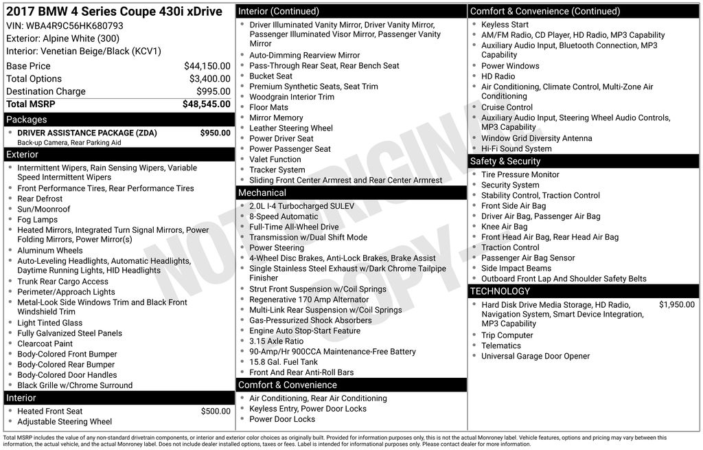 4-Wheel Disc Brakes, 9 Speakers, ABS brakes, Air Conditioning, Alloy wheels, AM/FM radio, Anti-whiplash front head restraints, Auto-dimming door mirrors, Auto-dimming Rear-View mirror, Automatic temperature control, Brake assist, Bumpers: body-color, CD player, Delay-off headlights, Driver door bin, Driver vanity mirror, Dual front impact airbags, Dual front side impact airbags, Electronic Stability Control, Emergency communication system: BMW Assist eCall, Four wheel independent suspension, Front anti-roll bar, Front Bucket Seats, Front Center Armrest, Front dual zone A/C, Front fog lights, Front reading lights, Fully automatic headlights, Garage door transmitter, Genuine wood console insert, Genuine wood dashboard insert, Genuine wood door panel insert, Hands-Free Bluetooth & USB Audio Connection, Heated door mirrors, Hi-Fi Sound System, High intensity discharge headlights: Bi-xenon, Illuminated entry, Knee airbag, Leather Shift Knob, Leather steering wheel, Low tire pressure warning, Memory seat, Occupant sensing airbag, Outside temperature display, Overhead airbag, Panic alarm, Passenger door bin, Passenger vanity mirror, Power door mirrors, Power driver seat, Power Front Seats, Power moonroof, Power passenger seat, Power steering, Power windows, Radio data system, Radio: Anti-Theft AM/FM/HD Stereo CD/MP3 Player, Rain sensing wipers, Rear air conditioning, Rear anti-roll bar, Rear reading lights, Rear seat center armrest, Rear window defroster, Remote keyless entry, Security system, SensaTec Leatherette Upholstery, Speed control, Speed-sensing steering, Speed-Sensitive Wipers, Split folding rear seat, Sport Seats, Sport steering wheel, Steering wheel mounted audio controls, Tachometer, Telescoping steering wheel, Tilt steering wheel, Traction control, Trip computer, Turn signal indicator mirrors, Variably intermittent wipers, Wheels: 18 x 8 Lt Alloy Double-Spoke (Style 397). Mineral White Metallic 2017 BMW 4 Series 430i xDrive 8-Speed Automatic 2.0L 4-Cylinder TwinPower Turbo AWD