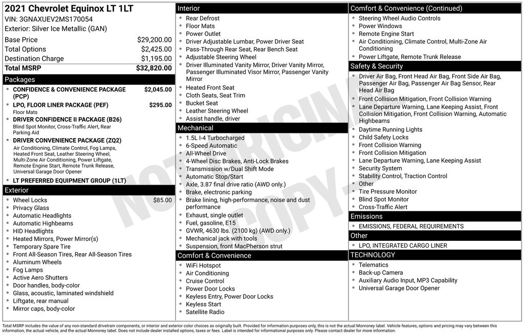 AWD, 17" Aluminum Wheels, 2 Rear USB Charging-Only Ports, 2 USB Ports & Auxiliary Input Jack, 2-Way Power Driver Lumbar Control Seat Adjuster, 3-Spoke Leather-Wrapped Steering Wheel, 3.87 Final Drive Axle Ratio, 4-Wheel Disc Brakes, 6 Speaker Audio System Feature, 6 Speakers, 8-Way Power Driver Seat Adjuster, ABS brakes, Air Conditioning, All-Weather Floor Liners (LPO), Alloy wheels, AM/FM radio: SiriusXM, Apple CarPlay/Android Auto, Auto High-beam Headlights, Bluetooth® For Phone, Brake assist, Bumpers: body-color, Compass, Confidence & Convenience Package, Delay-off headlights, Driver Confidence II Package, Driver Convenience Package, Driver door bin, Driver vanity mirror, Dual front impact airbags, Dual front side impact airbags, Dual Zone Automatic Climate Control, Electronic Stability Control, Emergency communication system: OnStar and Chevrolet connected services capable, Floor Liner Package (LPO), Four wheel independent suspension, Front anti-roll bar, Front Bucket Seats, Front Center Armrest, Front Fog Lamps, Front Passenger 4-Way Manual Seat Adjuster, Front reading lights, Fully automatic headlights, Heated door mirrors, Heated Driver & Front Passenger Seats, High-Intensity Discharge Headlights, Illuminated entry, Integrated Cargo Liner (LPO), Lane Change Alert w/Side Blind Zone Alert, Low tire pressure warning, Occupant sensing airbag, Outside temperature display, Overhead airbag, Overhead console, Panic alarm, Passenger door bin, Passenger vanity mirror, Power door mirrors, Power driver seat, Power steering, Power windows, Preferred Equipment Group 1LT, Premium audio system: Chevrolet Infotainment 3, Premium Cloth Seat Trim, Radio data system, Radio: Chevrolet Infotainment 3 System w/AM/FM, Rear anti-roll bar, Rear Cross Traffic Alert, Rear Park Assist w/Audible Warning, Rear Power Liftgate, Rear reading lights, Rear seat center armrest, Rear window defroster, Rear window wiper, Remote keyless entry, Remote Start, Security system, Set of 4 Wheel Locks (LPO), SiriusXM Radio, Speed control, Speed-sensing steering, Split folding rear seat, Spoiler, Steering wheel mounted audio controls, Tachometer, Telescoping steering wheel, Tilt steering wheel, Traction control, Trip computer, Universal Home Remote, Variably intermittent wipers, AWD. Silver Ice Metallic 2021 Chevrolet Equinox LT 6-Speed Automatic Electronic with Overdrive 1.5L DOHC AWD