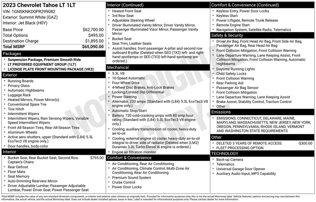 4WD, Black Leather, 10-Way Power Driver & Passenger Seat Adjusters, 1st & 2nd Row Color-Keyed Carpeted Floor Mats, 2nd Row Manual Bucket Seats, 3.23 Rear Axle Ratio, 3rd row seats: split-bench, 4-Wheel Disc Brakes, 9 Speakers, ABS brakes, Air Conditioning, Alloy wheels, AM/FM radio: SiriusXM with 360L, Apple CarPlay/Android Auto, Auto High-beam Headlights, Auto-Dimming Inside Rear-View Mirror, Auto-dimming Rear-View mirror, Automatic temperature control, Bose 9-Speaker Stereo Audio System Feature, Brake assist, Bright Front & Rear Door Sill Plates, Bumpers: body-color, Color-Keyed Carpeting Floor Covering, Compass, Delay-off headlights, Deleted 3 Years of Remote Access, Driver & Front Outboard Passenger Airbags, Driver door bin, Driver vanity mirror, Dual front impact airbags, Dual front side impact airbags, Electronic Stability Control, Emergency communication system: OnStar and Chevrolet connected services capable, Enhanced Driver Information Center, Floor Console w/Storage Area, Four wheel independent suspension, Front anti-roll bar, Front Bucket Seats, Front Center Armrest, Front dual zone A/C, Front High-Back Reclining Bucket Seats, Front reading lights, Fully automatic headlights, Garage door transmitter, Hands-Free Rear Power Programmable Liftgate, Heated door mirrors, Heated Driver & Front Passenger Seats, Heated front seats, Illuminated entry, Infotainment Display, Leather-Appointed Seat Trim, LED Daytime Running Lamps, License Plate Front Mounting Package, Low tire pressure warning, Memory seat, Memory Settings for Driver, Navigation System, Occupant sensing airbag, Outside temperature display, Overhead airbag, Overhead console, Panic alarm, Passenger door bin, Passenger vanity mirror, Power door mirrors, Power driver seat, Power Liftgate, Power passenger seat, Power steering, Power windows, Preferred Equipment Group 1LT, Premium audio system: Chevrolet Infotainment 3 Premium, Premium Smooth Ride Suspension, Radio: Chevrolet Infotainment 3 Premium System, Rain sensing wipers, Rear air conditioning, Rear anti-roll bar, Rear reading lights, Rear seat center armrest, Rear window defroster, Rear window wiper, Remote keyless entry, Remote Start, Roof rack: rails only, Security system, SiriusXM Radio w/360L, Speed control, Speed-sensing steering, Split folding rear seat, Spoiler, Steering wheel mounted audio controls, Tachometer, Telescoping steering wheel, Tilt steering wheel, Traction control, Trip computer, Universal Home Remote, Variably intermittent wipers, Voltmeter, Wheels: 18" x 8.5" Bright Silver Painted Aluminum, Wireless Charging, Wrapped Steering Wheel, 4WD, Black Leather. Summit White 2023 Chevrolet Tahoe LT 10-Speed Automatic with Overdrive EcoTec3 5.3L V8 4WD