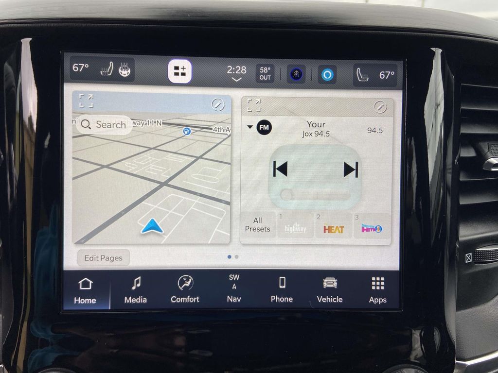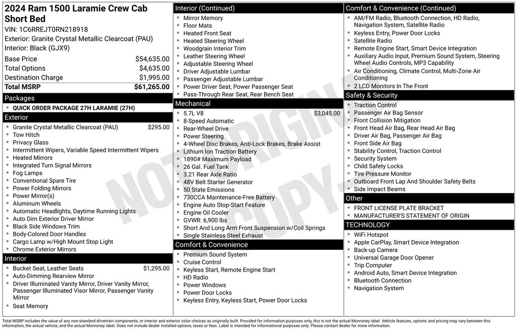 10 Speakers, 3 Rear Seat Head Restraints, 3.21 Rear Axle Ratio, 4 Way Front Headrests, 4-Wheel Disc Brakes, 48V Belt Starter Generator, 4G LTE Wi-Fi Hot Spot, ABS brakes, Air Conditioning, Alloy wheels, AM/FM radio: SiriusXM with 360L, Apple CarPlay, Apple CarPlay/Android Auto, Audio memory, Auto-dimming door mirrors, Auto-Dimming Exterior Driver Mirror, Auto-dimming Rear-View mirror, Automatic temperature control, Brake assist, Bumpers: chrome, Chrome Exterior Mirrors, Compass, Connected Travel & Traffic Services, Connectivity - US/Canada, Convex Wide-Angle Exterior Mirror Insert, Delay-off headlights, Driver door bin, Driver Seat Memory, Driver vanity mirror, Dual front impact airbags, Dual front side impact airbags, Electronic Stability Control, Exterior Mirrors Courtesy Lamps, Exterior Mirrors w/Heating Element, Exterior Mirrors w/Memory, Exterior Mirrors w/Supplemental Signals, Exterior Parking Camera Rear, For Details, Visit DriveUconnect.com, For More Info, Call 800-643-2112, Front anti-roll bar, Front Center Armrest w/Storage, Front dual zone A/C, Front fog lights, Front License Plate Bracket, Front reading lights, Front Seat Back Map Pockets, Front wheel independent suspension, Fully automatic headlights, Garage door transmitter, Global Telematics Box Module (TBM), Google Android Auto, GPS Navigation, HD Radio, Heated door mirrors, Heated Front Seats, Heated front seats, Heated Steering Wheel, Heated steering wheel, Illuminated entry, Integrated Voice Command w/Bluetooth, Leather steering wheel, Leather Trim 40/20/40 Bench Seat, Low tire pressure warning, Manufacturer's Statement of Origin, Memory seat, Navigation System, Occupant sensing airbag, Outside temperature display, Overhead airbag, Overhead console, Panic alarm, Passenger door bin, Passenger vanity mirror, Power 2-Way Driver Lumbar Adjust, Power 2-Way Passenger Lumbar Adjust, Power 8-Way Driver & Passenger Seats, Power door mirrors, Power driver seat, Power passenger seat, Power steering, Power windows, Power-Folding Mirrors, Quick Order Package 27H Laramie, Radio data system, Radio: Uconnect 5 Nav w/8.4" Display, RAM Grille Badge - Chrome, Rear 60/40 Folding Seat, Rear anti-roll bar, Rear seat center armrest, Rear step bumper, Remote keyless entry, Security system, SiriusXM Radio Service, SiriusXM w/360L, Speed control, Split folding rear seat, Steering wheel mounted audio controls, Tachometer, Telescoping steering wheel, Tilt steering wheel, Traction control, Trip computer, Turn signal indicator mirrors, Variably intermittent wipers, Ventilated Front Seats, Ventilated front seats, Voltmeter, Wheels: 18" x 8" Aluminum Base Painted. Granite Crystal Metallic Clearcoat 2024 Ram 1500 Laramie 8-Speed Automatic HEMI 5.7L V8 Multi Displacement VVT eTorque RWD