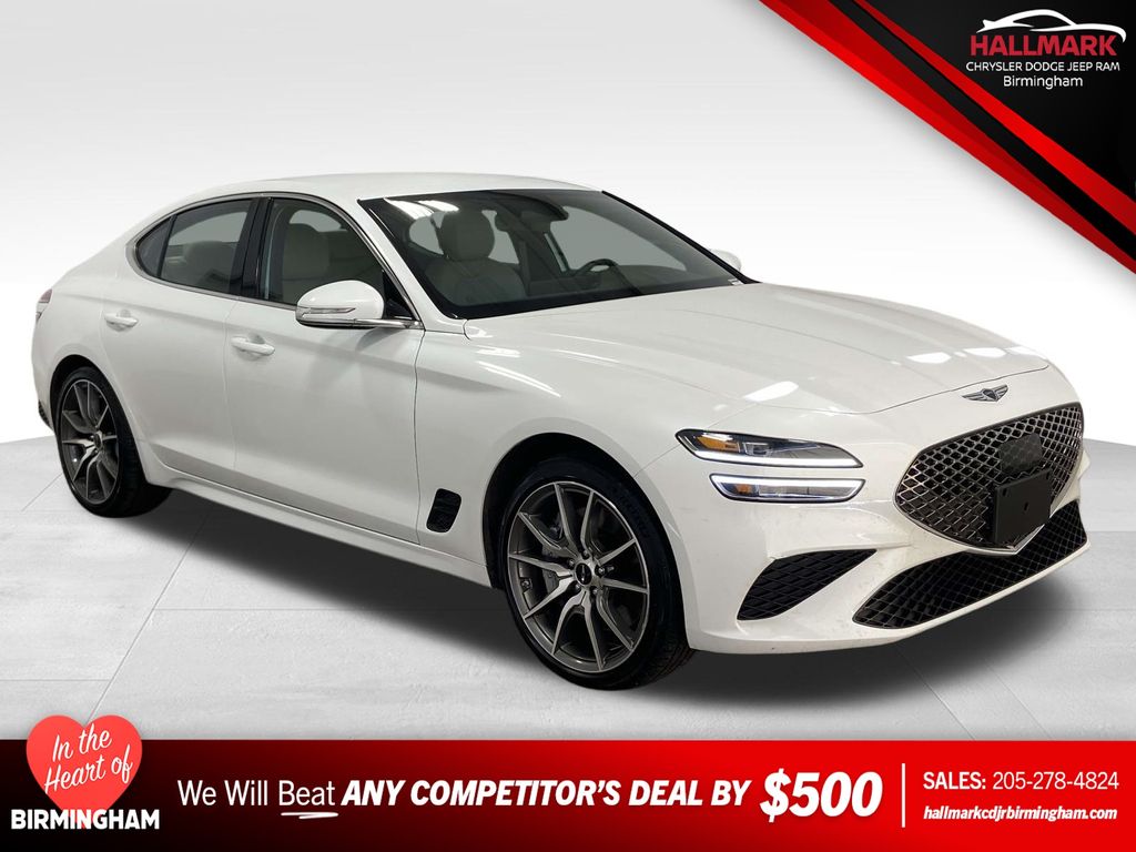 4-Wheel Disc Brakes, 6 Speakers, ABS brakes, Air Conditioning, Alloy wheels, AM/FM radio: SiriusXM, Android Auto & Apple CarPlay, Anti-whiplash front head restraints, Auto High-beam Headlights, Auto-dimming Rear-View mirror, Automatic temperature control, Brake assist, Bumpers: body-color, Delay-off headlights, Driver door bin, Driver vanity mirror, Dual front impact airbags, Dual front side impact airbags, Electronic Stability Control, Emergency communication system: Genesis Connected Services, Exterior Parking Camera Rear, Four wheel independent suspension, Front anti-roll bar, Front Bucket Seats, Front Center Armrest, Front dual zone A/C, Front reading lights, Fully automatic headlights, Garage door transmitter: HomeLink, Heated door mirrors, Heated front seats, Heated Multi-Adjustable Front Bucket Seats, Heated steering wheel, Illuminated entry, Knee airbag, Leather steering wheel, Leatherette Seating Surfaces, Low tire pressure warning, Navigation System, Occupant sensing airbag, Option Group 01, Outside temperature display, Overhead airbag, Overhead console, Panic alarm, Passenger door bin, Passenger vanity mirror, Power door mirrors, Power driver seat, Power passenger seat, Power steering, Power windows, Radio: AM/FM/SiriusXM/HD Audio System, Rear anti-roll bar, Rear reading lights, Rear seat center armrest, Rear side impact airbag, Rear window defroster, Remote keyless entry, Security system, Speed control, Speed-Sensitive Wipers, Split folding rear seat, Steering wheel mounted audio controls, Tachometer, Telescoping steering wheel, Traction control, Trip computer, Turn signal indicator mirrors, Variably intermittent wipers, Wheels: 19" x 8.0J Fr & 19" x 8.5J Rr Alloy. Uyuni White 2025 Genesis G70 2.5T 8-Speed Automatic I4 AWD